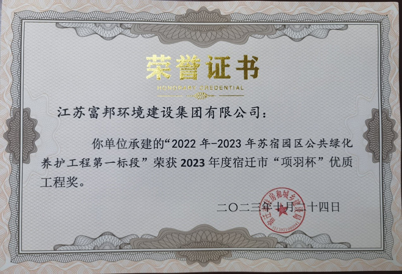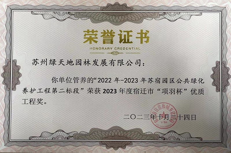 好消息!蘇宿園區(qū)公共綠化養(yǎng)護工程一、二標段同時榮獲2023年“項羽杯”優(yōu)質(zhì)工程獎