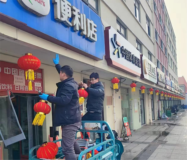 物業(yè)管理部工作人員扛上梯子,拿著燈籠,為沿街商鋪門前掛上了一個(gè)個(gè)大紅燈籠,將我們商業(yè)區(qū)裝點(diǎn)的漂漂亮亮。過(guò)年掛燈籠是中國(guó)傳統(tǒng)習(xí)俗,紅色代表喜慶,圓形燈籠則寓意團(tuán)圓美滿,紅燈籠象征著平安祥和和紅紅火火。建發(fā)公司希望商鋪們?nèi)兆舆^(guò)的紅紅火火,過(guò)一個(gè)平安祥和幸福年。