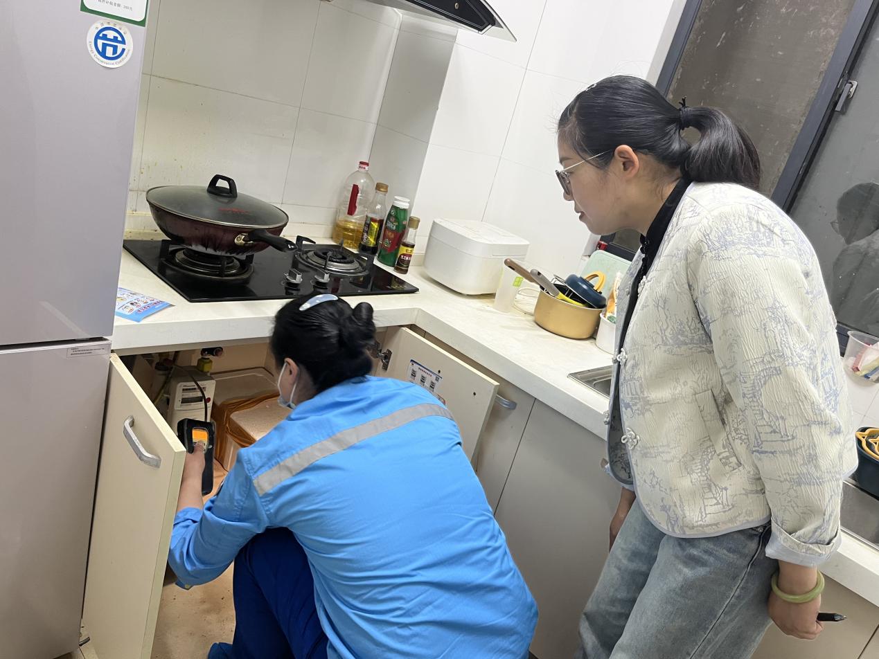 工作人員對(duì)燃?xì)庥脩糸_展逐戶檢查,重點(diǎn)對(duì)天然氣接口軟管是否老化、燃?xì)馄骶呤欠癯谑褂?、是否有熄火保護(hù)措施,燃?xì)忾y門是否正常使用等問(wèn)題進(jìn)行全面檢查。在檢查過(guò)程中,發(fā)現(xiàn)廚房操作間積堆物品、線路交叉重疊等現(xiàn)象,要求客戶立即整改。