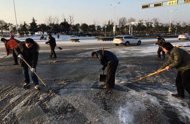 清晨6時(shí),市政部工作人員和環(huán)衛(wèi)工人已經(jīng)開始對(duì)轄區(qū)部分主要路段進(jìn)行除雪除冰作業(yè)。在凜冽寒風(fēng)中,他們不畏嚴(yán)寒,經(jīng)過近3小時(shí)的清掃除冰,截至上午9時(shí),青海湖西路、通達(dá)大道、紫金山路等主干道及蘇州公園人行道已基本完成路面積雪清掃。